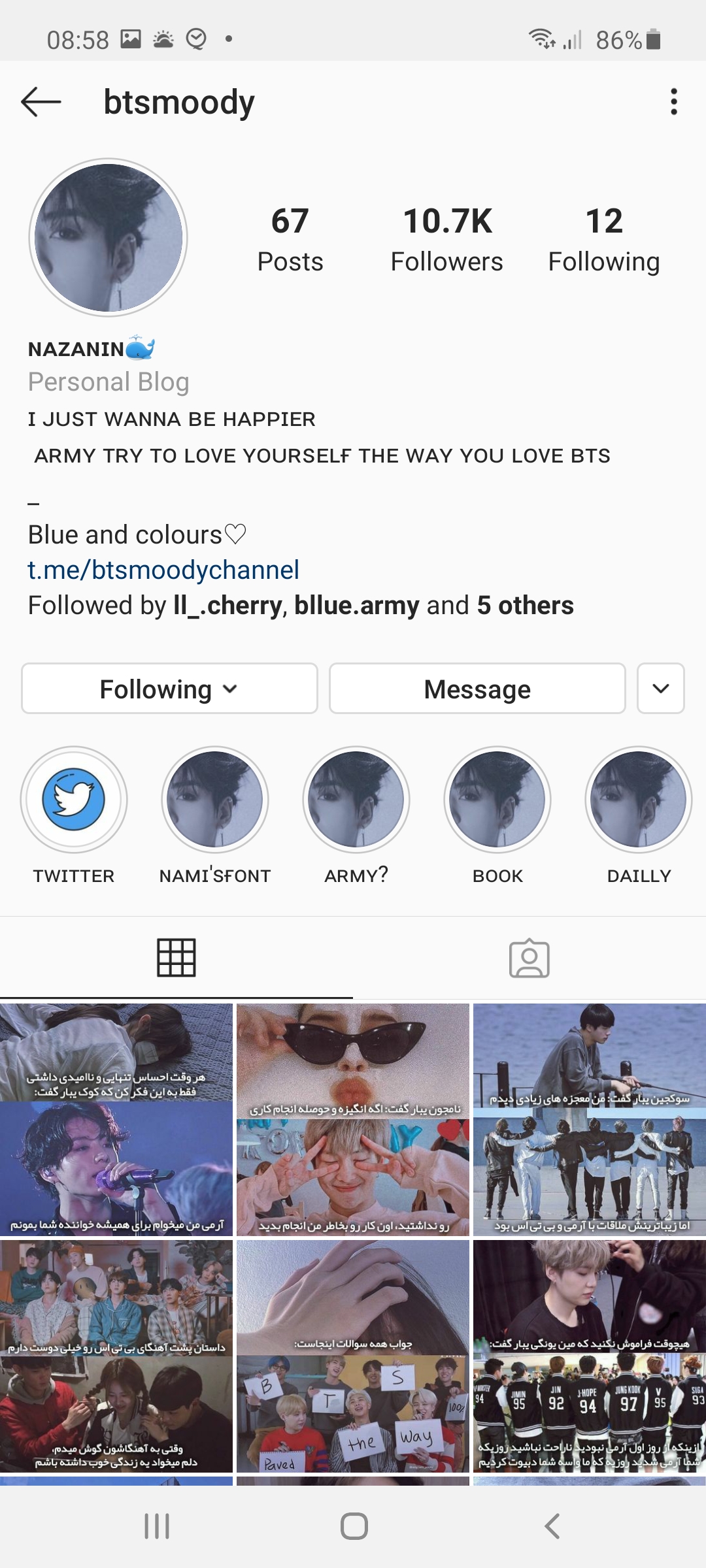 من از خیلی وقت پیش، یه پیج تکست و عکس نوشته از بی تی اس رو توی اینستا فالو داشتم و خب نمی دونم چرا... حتی ادیت هاشم آنچنان چنگی به دل نمی زدن، خیلی مبتدی و بد کیفیت بودن. با خودم می گفتم کی دیگه میاد اینو فالو می کنه؟ (وی بعدها به طرز فلاکت باری ضایع گشت که داستان آن را خواهیم گفت)